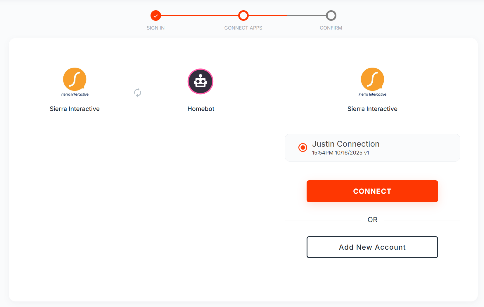 6. Select an existing Homebot Connection with "Connect" or build a new one.