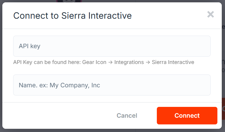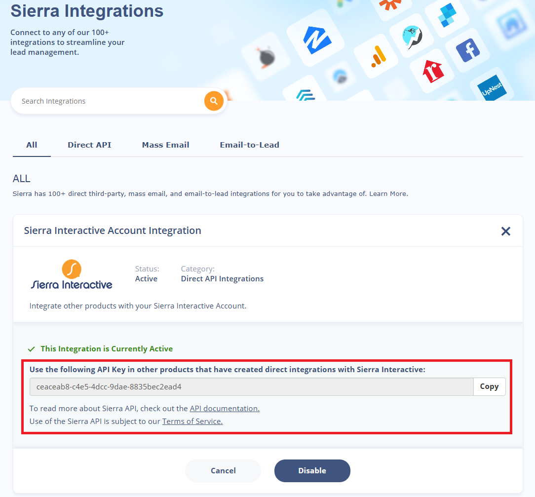 1. Retrieve your API Key from Sierra Interactive. Do this by logging into Sierra Interactive and navigating as following: "Settings" > "Integrations" > "Sierra Interactive" > "Copy" API Key.