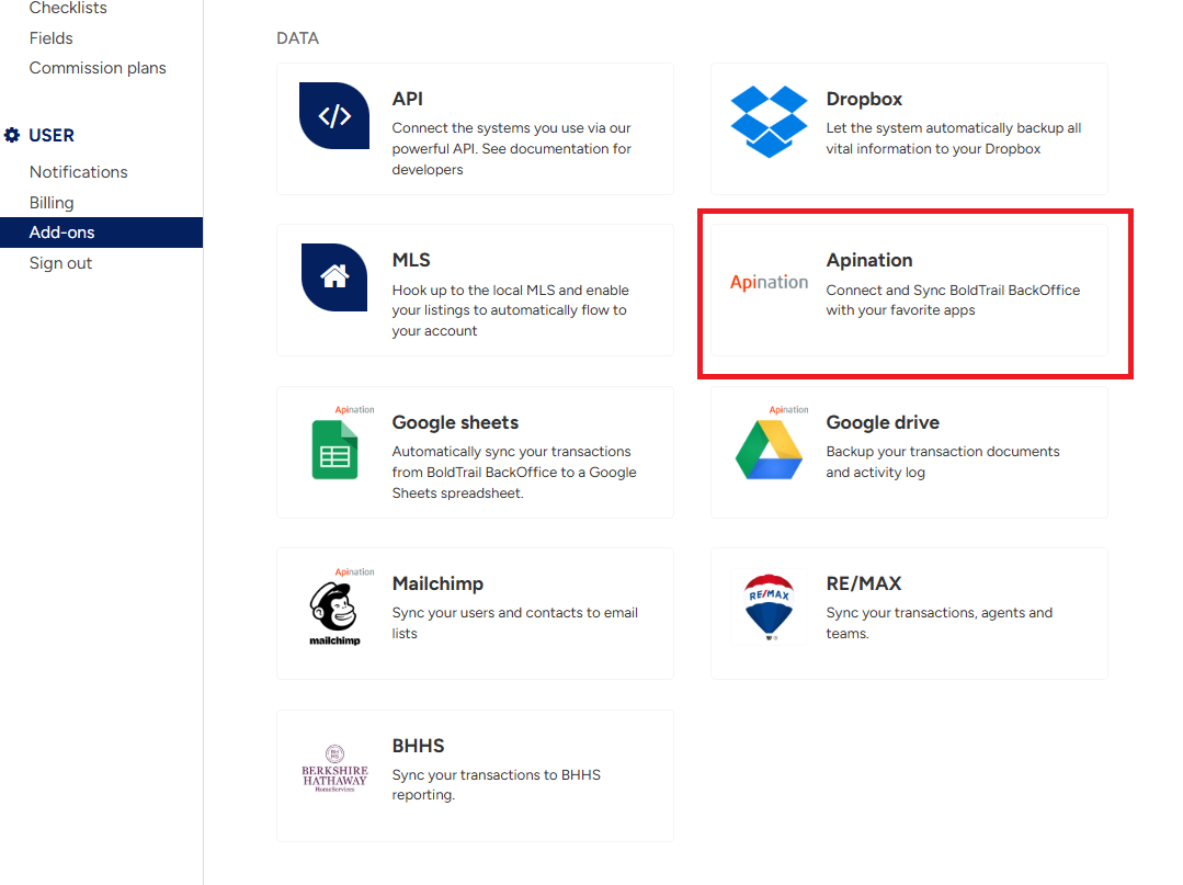 - Starting in Boldtrail Backoffice, navigate to your Add-ons and find "Apination."