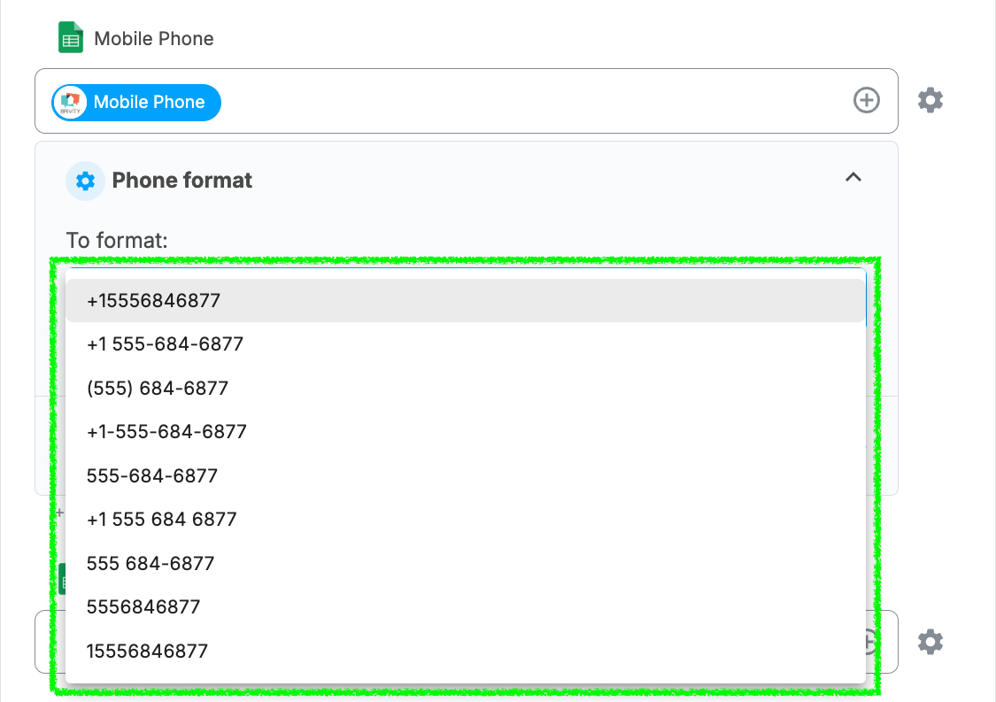 Different platforms store and expect phone numbers in different formats. If a destination system receives a phone number in the wrong format, it may reject the record, fail to sync, or store the value incorrectly. Phone Format handles this conversion automatically as part of the mapping.