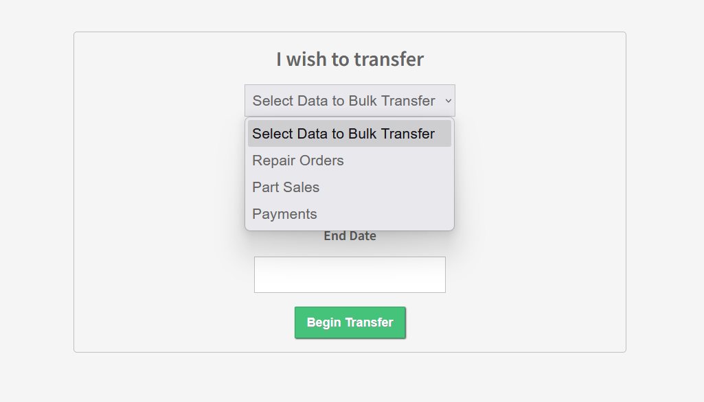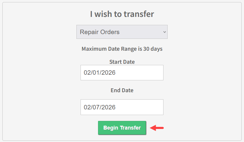 Choose the transaction type you want to transfer: Repair Order, Part Sales, or Payments. You will need to run the tool once for each transaction type.