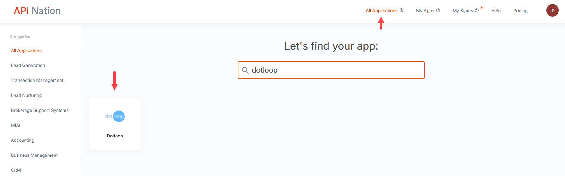 Select All Applications at the top of the page, search for "dotloop", and select the dotloop tile.