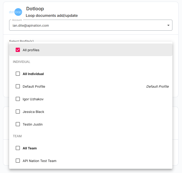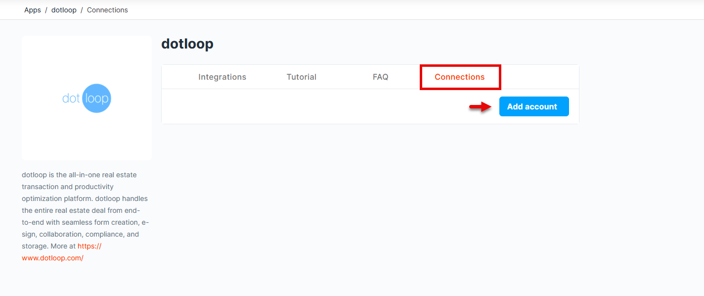 Select the Connections tab, then click Add Account. Enter the email and password for your dotloop account and click Approve to authorize API Nation.