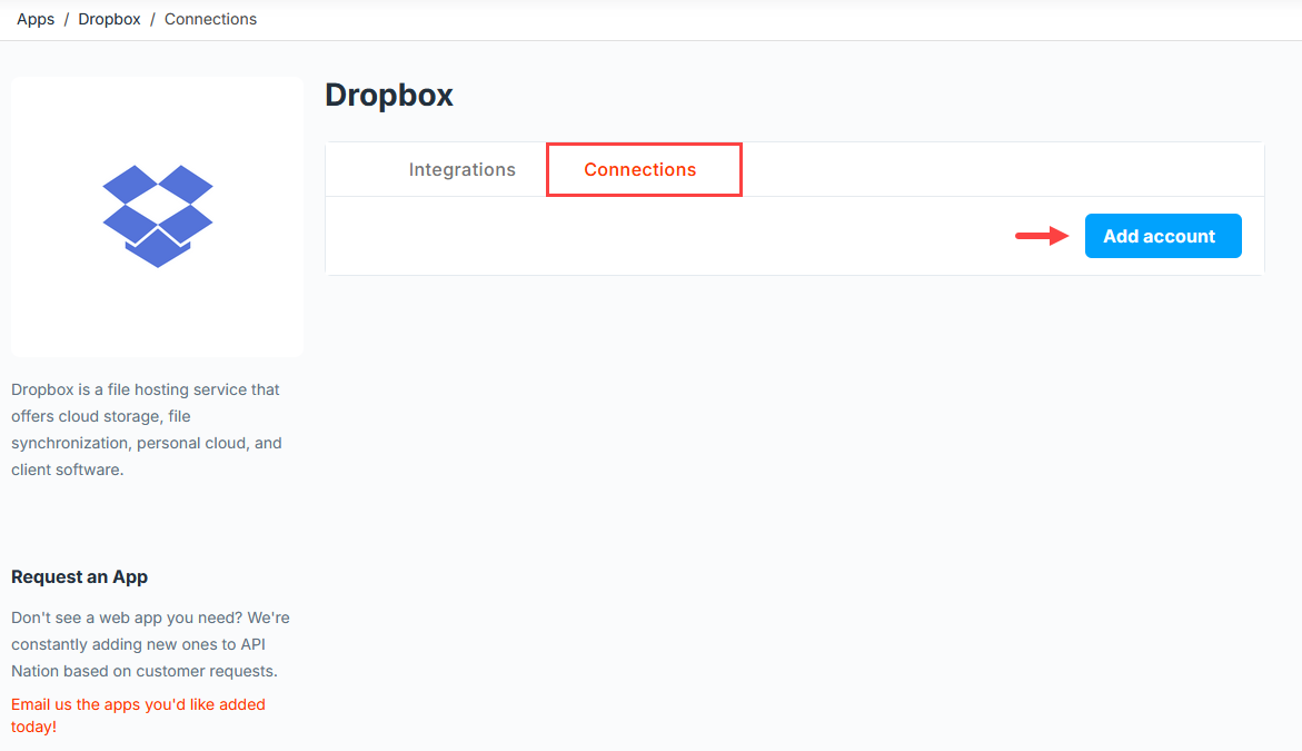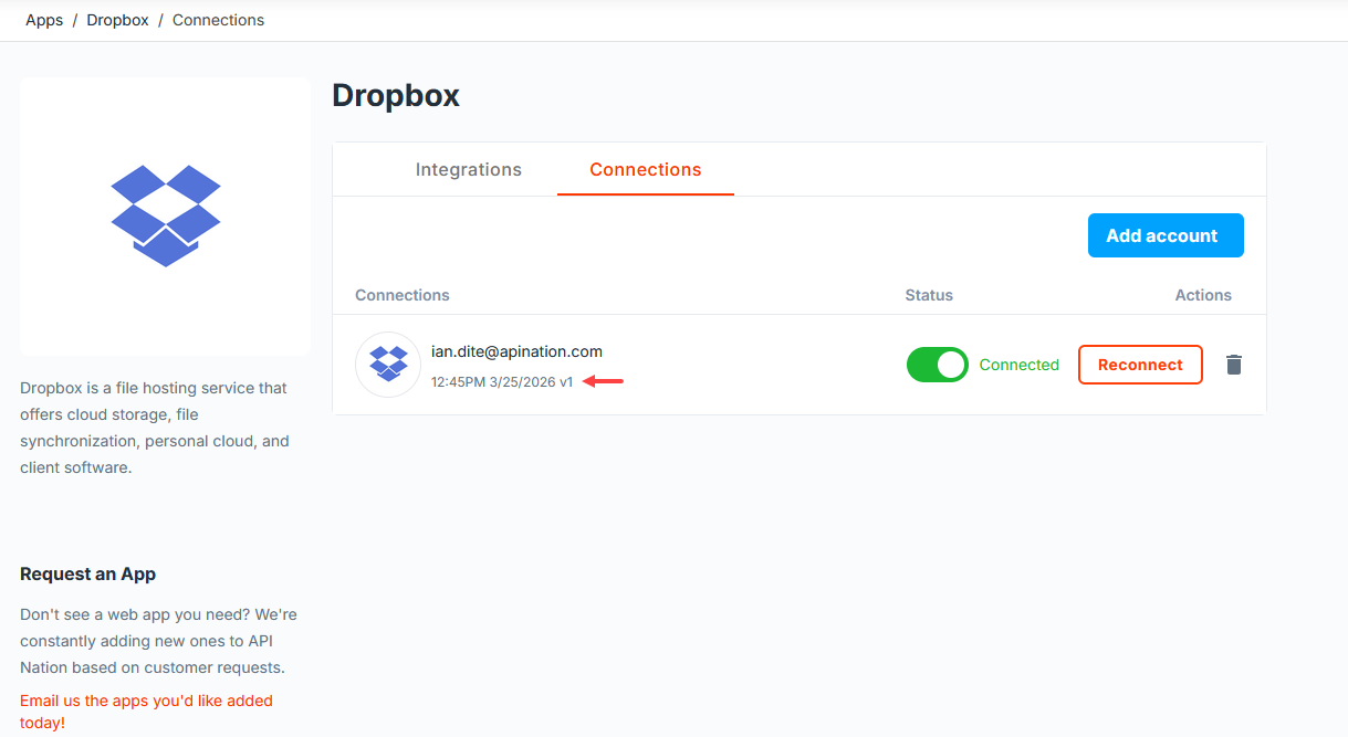 Select the Connections tab, then click Add Account. You will be redirected to Dropbox — sign in and allow API Nation the access required. Once complete you will be returned to the dashboard and your connection will be confirmed with a date/time stamp.