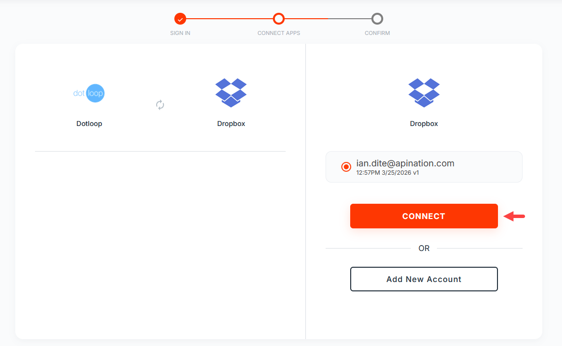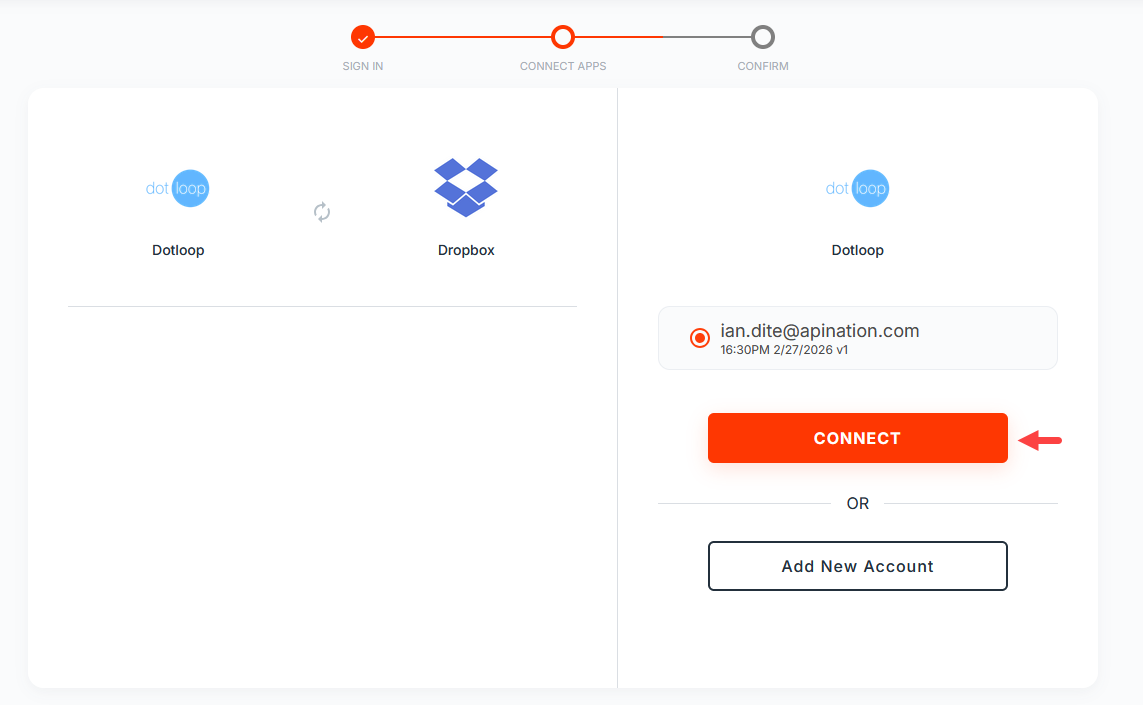 You will be prompted to select the accounts you wish to use for this integration. Since you connected your accounts in the previous steps, simply click Connect for both dotloop and Dropbox.