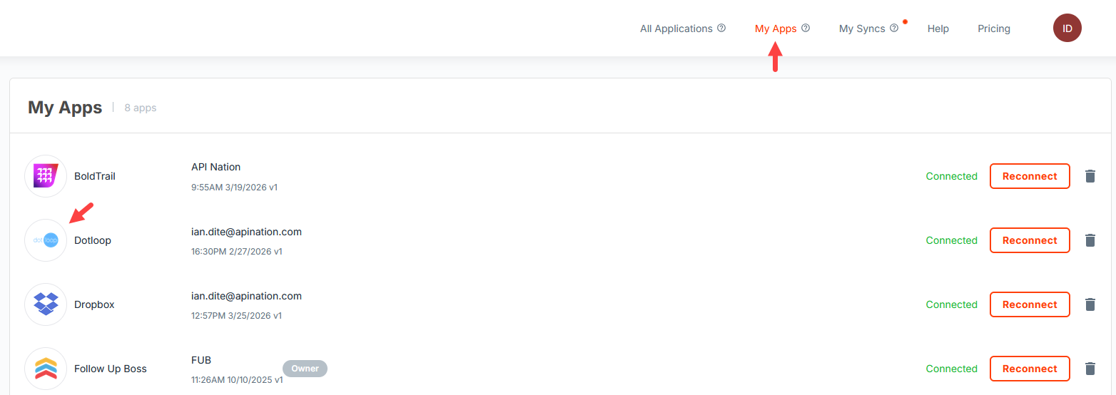 Re-check account connections. In the API Nation dashboard, confirm both your dotloop and Dropbox accounts show as connected. If either shows an error, disconnect and reconnect the account.