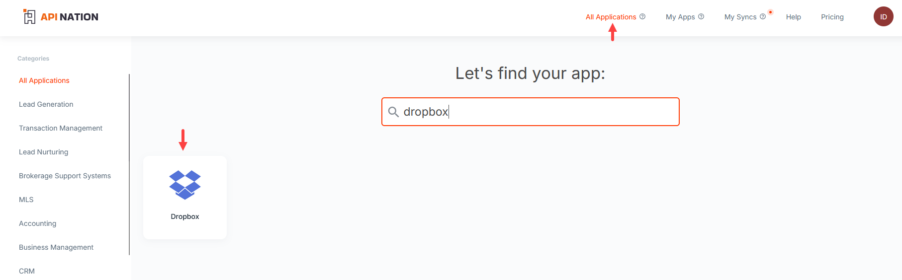 Select All Applications at the top of the page, search for "Dropbox", and select the Dropbox tile.