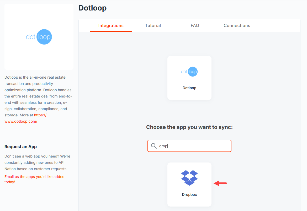 You will begin by connecting your dotloop and Dropbox accounts in API Nation. Once connected, any time a file is added or updated inside a dotloop loop, that file will automatically be synced to the Dropbox folder you specify during setup.
